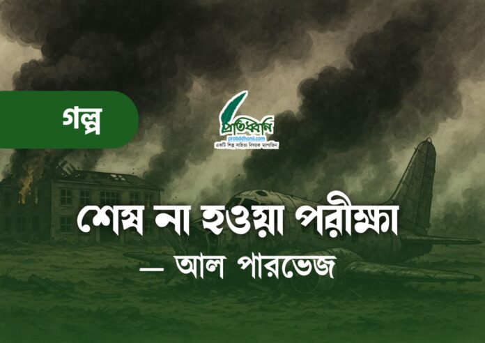ঠিক তখনই, আকাশটা যেন কানে তালা লাগিয়ে দিল। একটা ভয়ংকর, তীব্র গর্জন! প্রথমে ভেবেছিলাম মেঘের ডাক, কিন্তু এ শব্দ পৃথিবীর নয়। মাটিটা থরথর করে কেঁপে উঠল। কিছু বুঝে ওঠার আগেই, চোখের পলকে দেখলাম, একটা ধাতব দানব—একটা যুদ্ধবিমান—আগুন ছড়াতে ছড়াতে আমাদের জুনিয়র সেকশনের বিল্ডিংটার ওপর আছড়ে পড়ল।